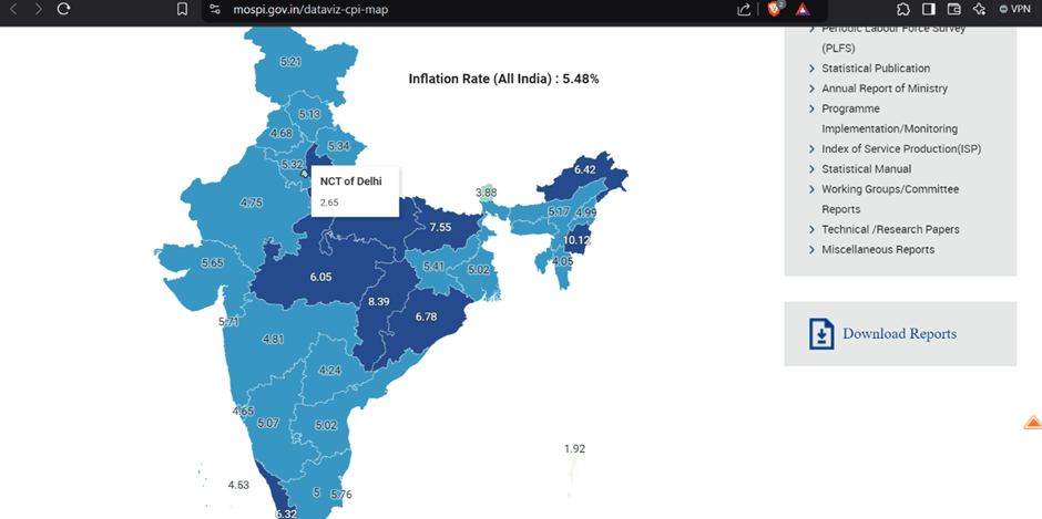 Inflation is lowest in Delhi among states at mere 2.65 %.