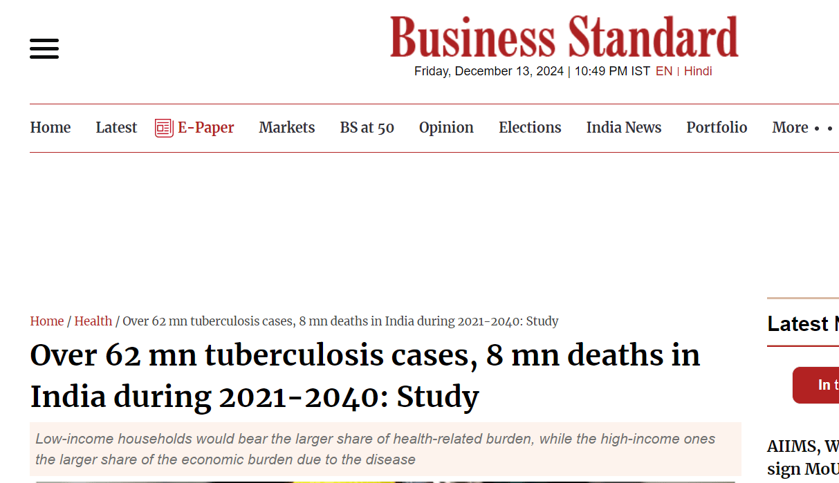 Over 62 mn tuberculosis cases, 8 mn deaths in India during 2021-2040 alongwith a Gross Domestic Product (GDP) loss of more than $146 billion, according to a study.