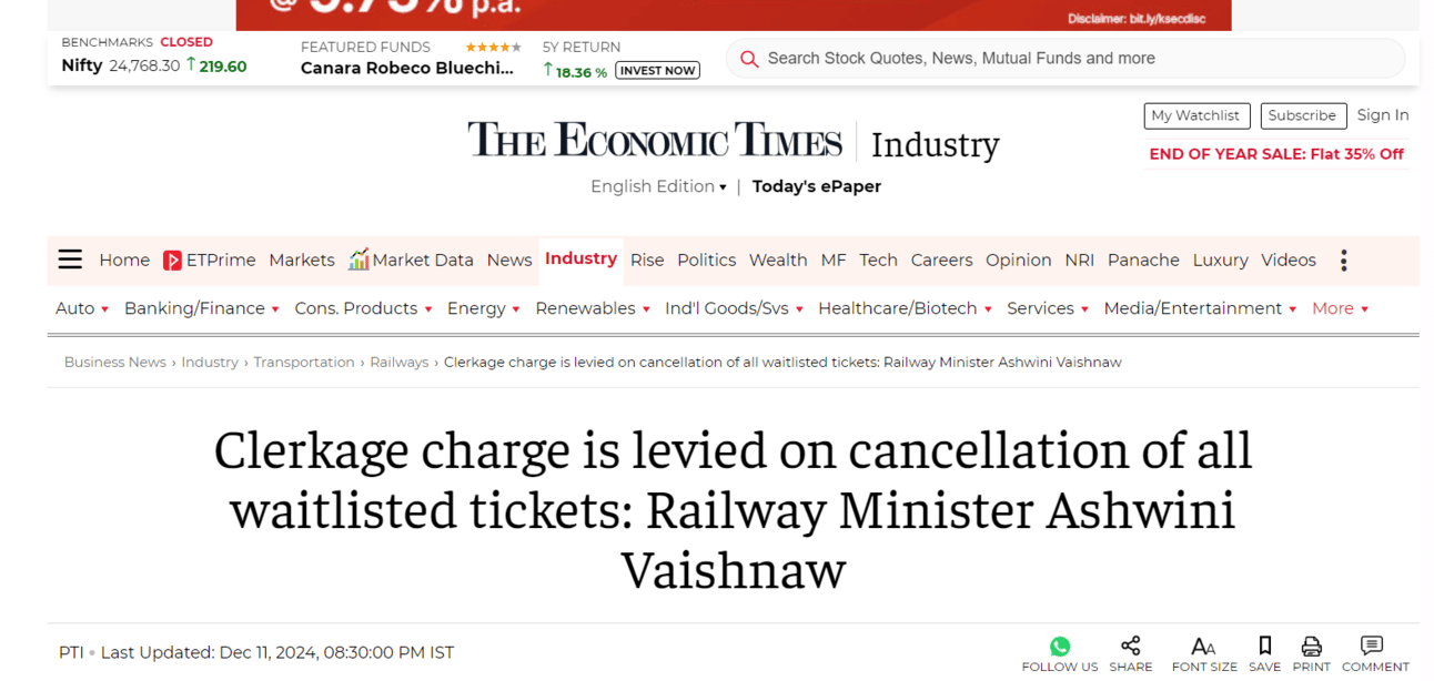The railway ministry levies clerkage charges on all waitlisted tickets and the revenue generated from all sources, including cancellation, is utilized for working expenses relating to maintenance and operations, the government said in the Lok Sabha in a written reply on Wednesday. If cancelled between 48 hours and 12 hours before departure, 25% of the fare is deducted, while if cancelled within 12 hours to 4 hours of departure, 50% of the fare is deducted.