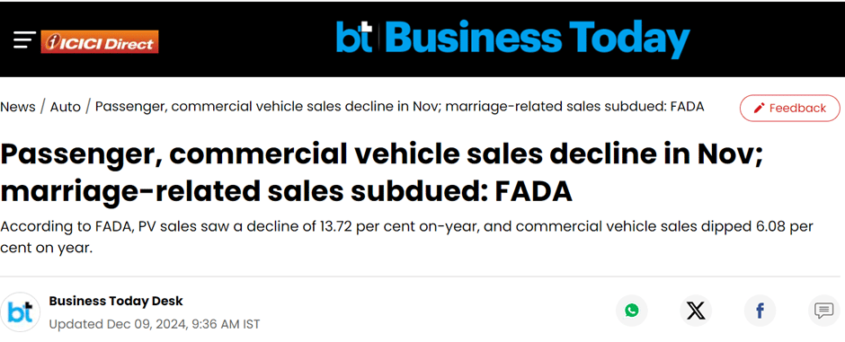 According to FADA, PV sales saw a decline of 13.72 per cent on-year, and commercial vehicle sales dipped 6.08 per cent on year.