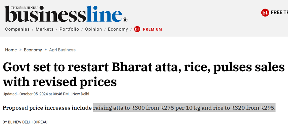 Price of base atta to ₹300 from ₹275 per 10 kg and rice to ₹320 from ₹295.