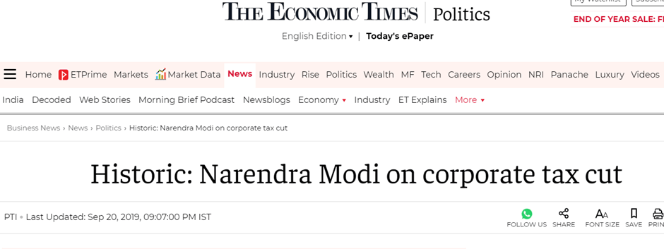 News of 2019. In the biggest reduction in 28 years, the government slashed corporate tax by almost 10 percentage points as it looked to pull the economy out of a six-year low growth and a 45-year high unemployment rate by reviving private investments with a Rs 1.45-lakh crore tax break.