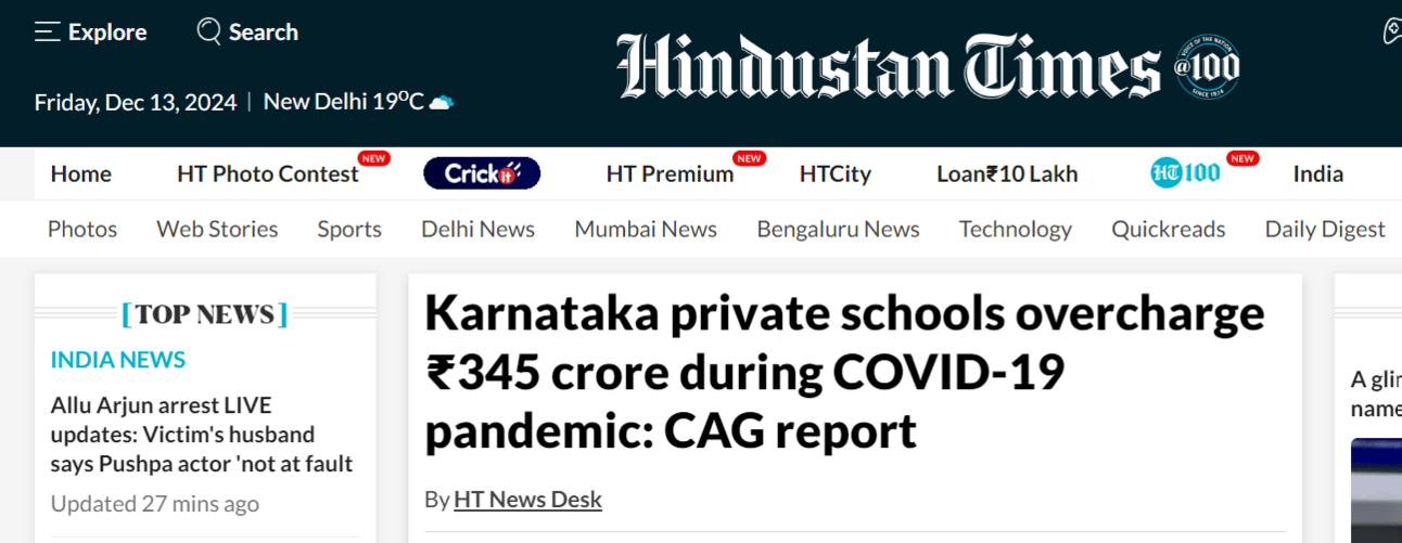 Private unaided schools in Karnataka collected an excess fee of ₹345.80 crore from students in the 2020-21 academic year, violating court directives, the CAG report said, PTI reported. It criticized the state government for its failure to regulate school fees and highlighted that the Department of School Education and Literacy lacked mechanisms to monitor the fees charged by private institutions.
