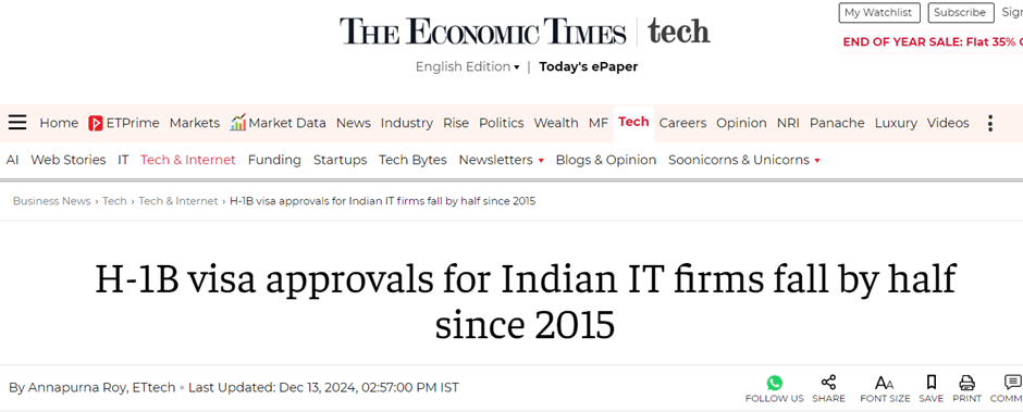 The top seven Indian-based IT companies saw a combined 7,299 H-1B visa petitions for new employment approved in fiscal year 2024, less than half the 14,792 approvals they received in FY2015, according to an analysis of official US data by the National Foundation for American Policy (NFAP).