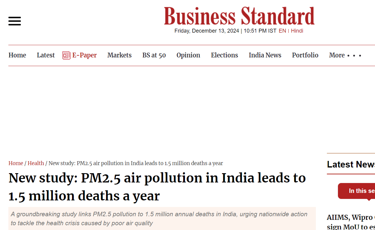 Air pollution has contributed to 16 million deaths in India in the past decade – new study. PM2.5 air pollution in India leads to 1.5 million deaths a year. Top polluted cities India 2024.