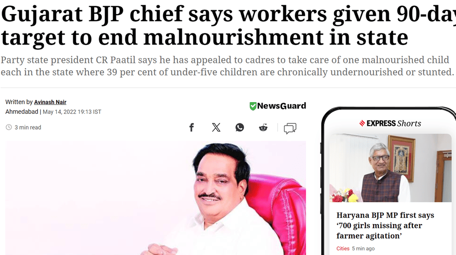 News in 2022. Gujarat BJP chief says workers given 90-day target to end malnourishment in state.