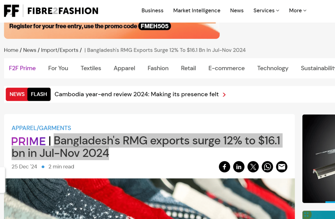 Bangladesh's RMG exports surge 12% to $16.1 bn in Jul-Nov 2024.
