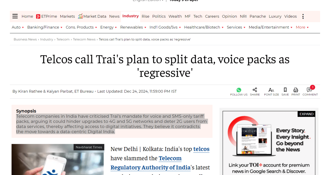 Telecom companies in India have criticised Trai's mandate for voice and SMS-only tariff packs, arguing it could hinder upgrades to 4G and 5G networks and deter 2G users from data services, thereby affecting access to digital initiatives. They believe it contradicts the move towards a data-centric Digital India.