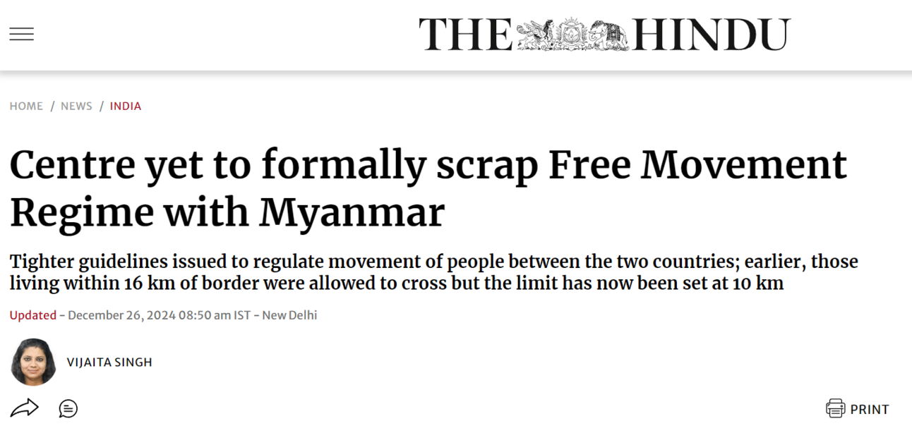 Centre yet to formally scrap Free Movement Regime with Myanmar. Tighter guidelines issued to regulate movement of people between the two countries; earlier, those living within 16 km of border were allowed to cross but the limit has now been set at 10 km