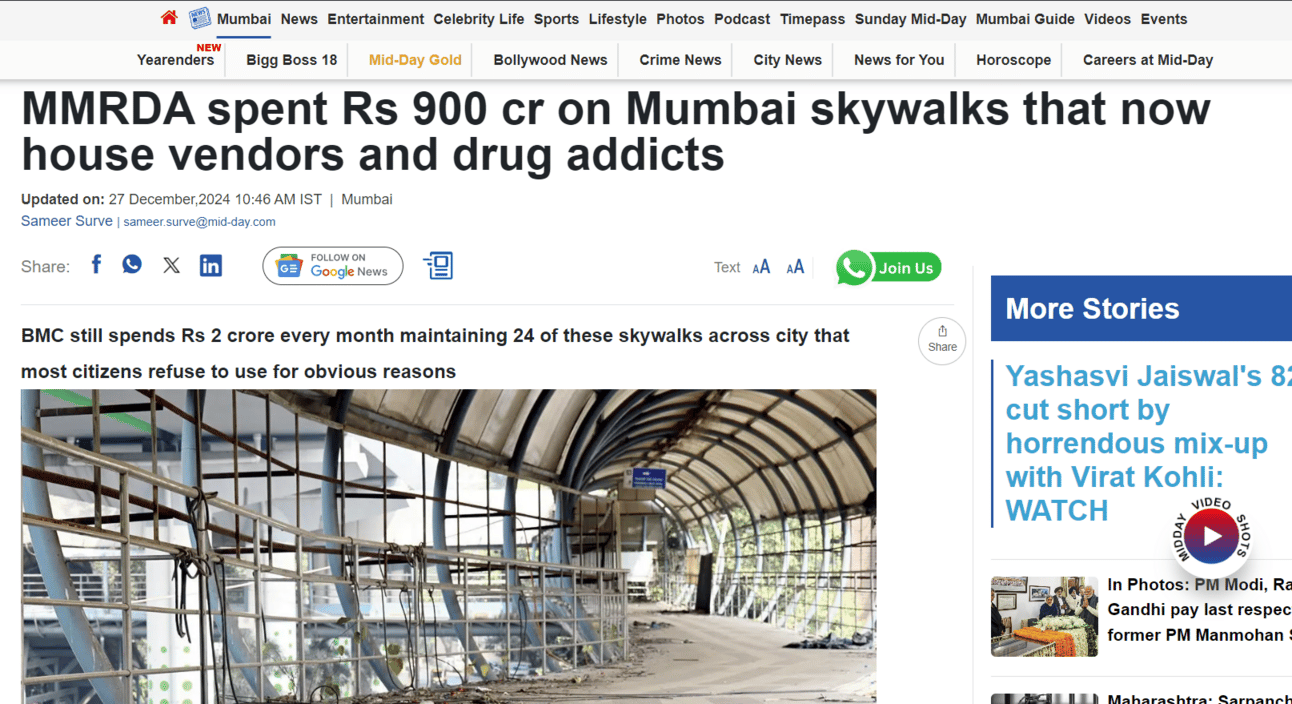 MMRDA spent Rs 900 cr on Mumbai skywalks that now house vendors and drug addicts. BMC still spends Rs 2 crore every month maintaining 24 of these skywalks across city that most citizens refuse to use for obvious reasons.