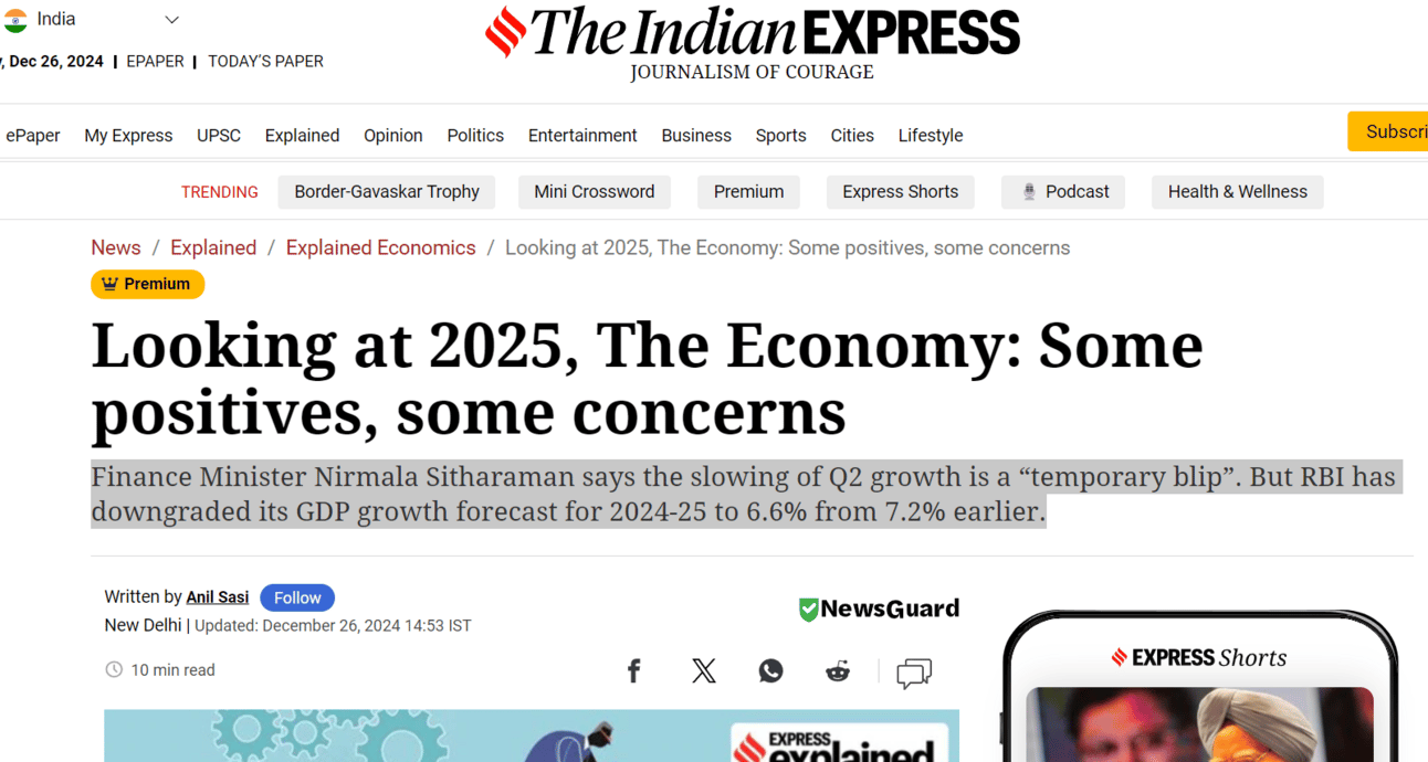 Finance Minister Nirmala Sitharaman says the slowing of Q2 growth is a “temporary blip”. But RBI has downgraded its GDP growth forecast for 2024-25 to 6.6% from 7.2% earlier.
