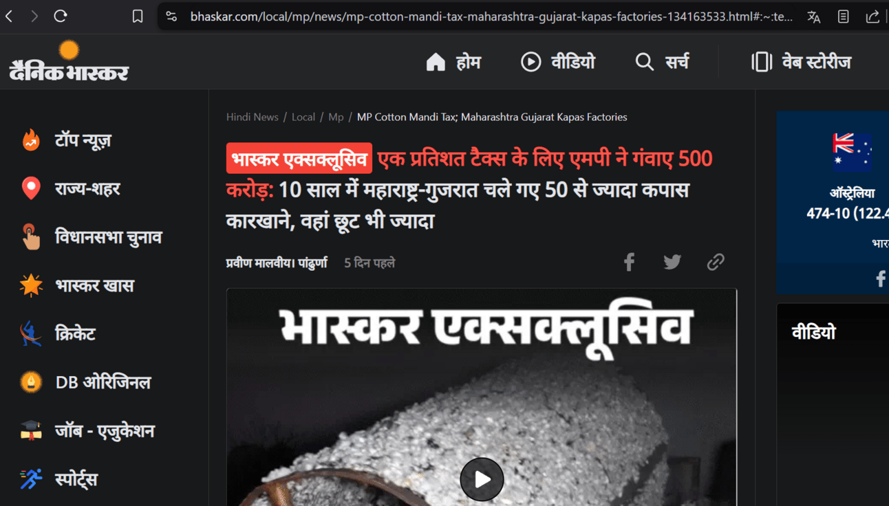 एक प्रतिशत टैक्स के लिए एमपी ने गंवाए 500 करोड़:10 साल में महाराष्ट्र-गुजरात चले गए 50 से ज्यादा कपास कारखाने, वहां छूट भी ज्यादा मध्यप्रदेश में एक रुपए मंडी टैक्स के साथ उपज पर 20 पैसे बांग्लादेशी शरणार्थी टैक्स भी लगाया जा रहा है। पहली नजर में बेहद कम लगने वाला ये मंडी टैक्स कारोबारियों के लिए बहुत मायने रखता है।