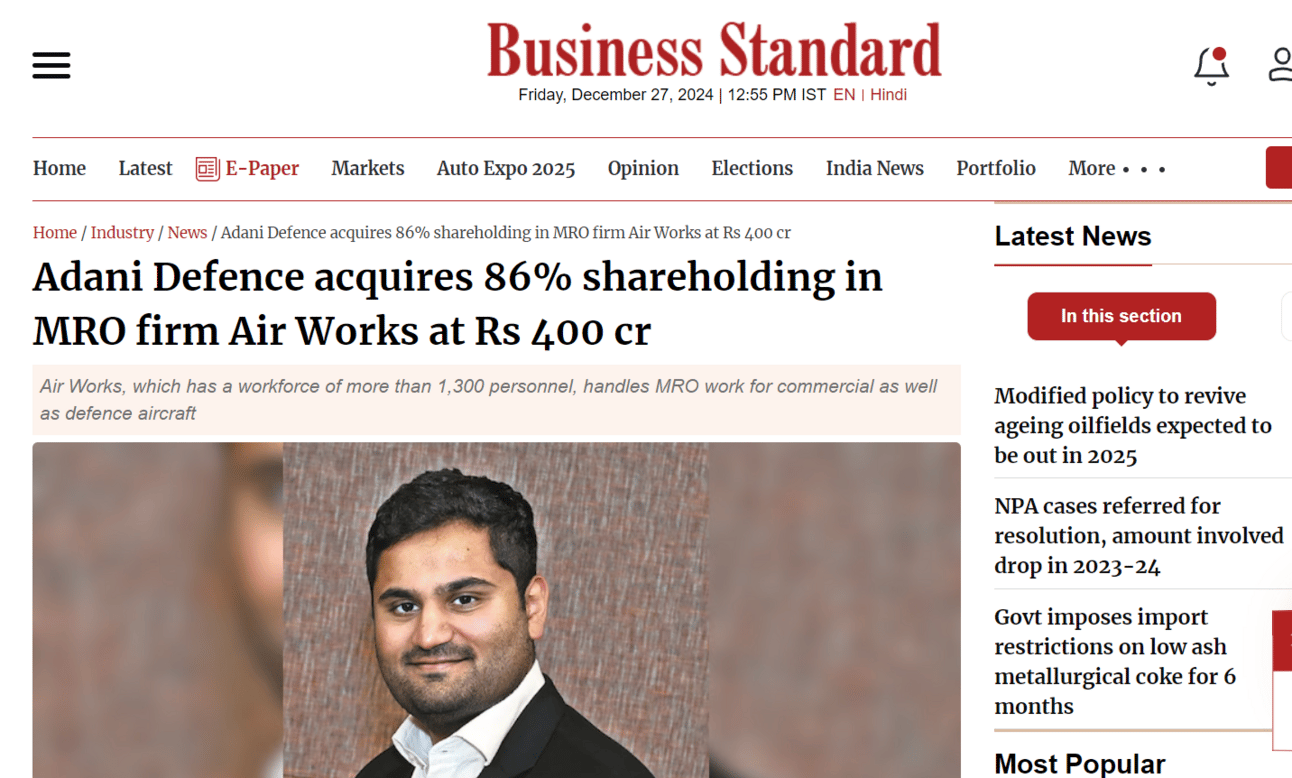 Adani Defence acquires 86% shareholding in MRO (maintenance, repair and overhaul (MRO) company) firm Air Works at Rs 400 cr.