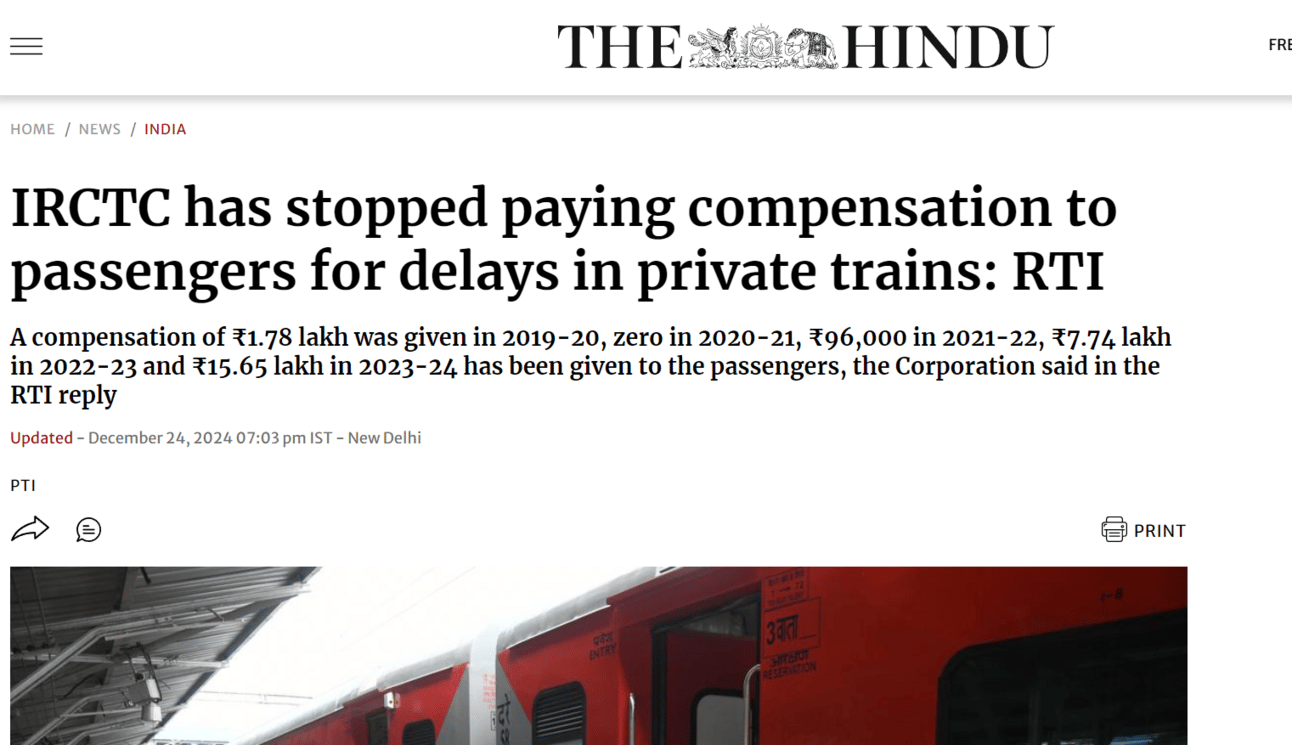IRCTC has stopped paying compensation to passengers for delays in private trains: RTI