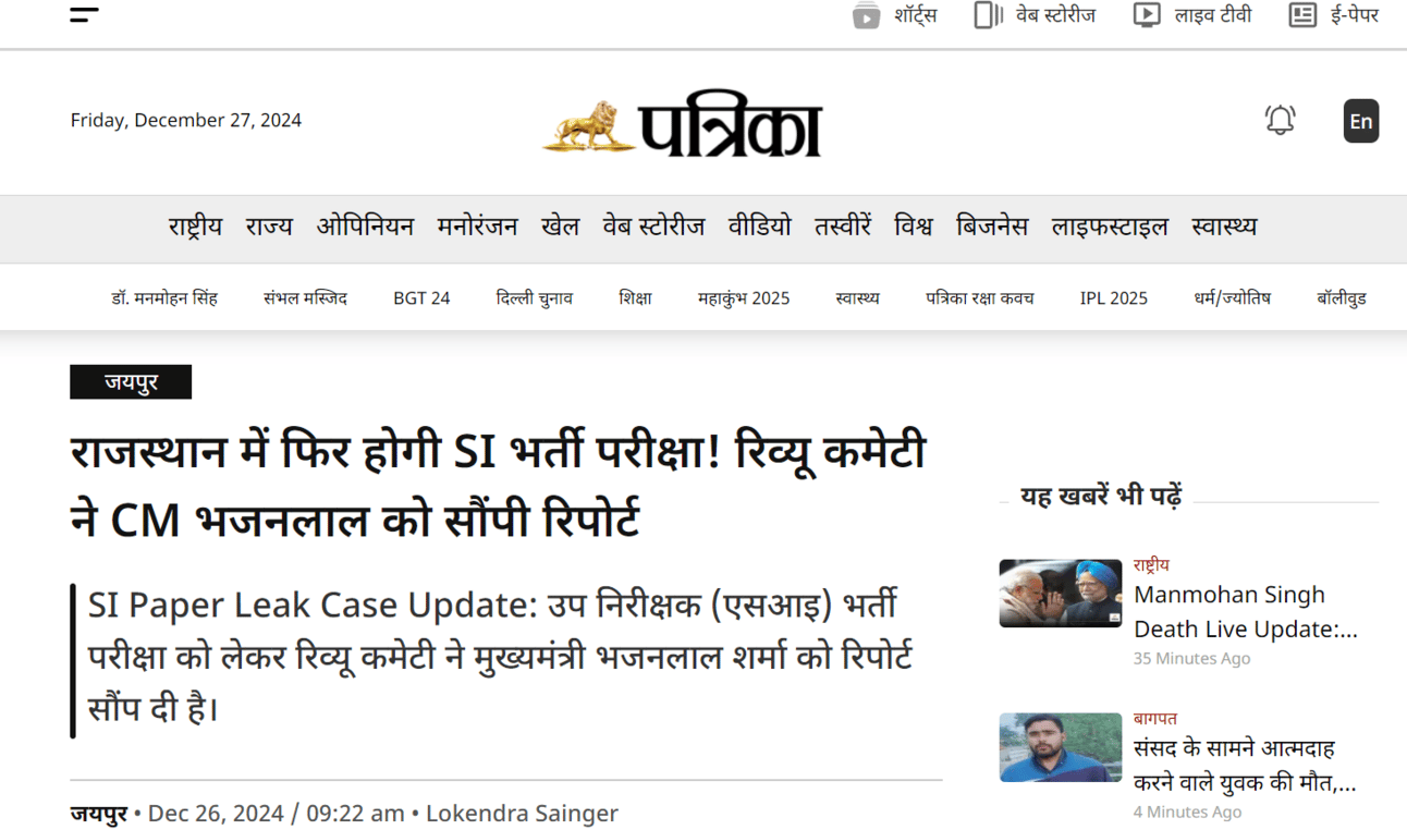 राजस्थान में फिर होगी SI भर्ती परीक्षा! रिव्यू कमेटी ने CM भजनलाल को सौंपी रिपोर्ट | एसआइ भर्ती 2021 के जरिए 859 पदों पर चयन किया गया था। इनमें से करीब चयनित 50 उपनिरीक्षक गिरफ्तार हो चुके हैं। इन सहित उपनिरीक्षक भर्ती को लेकर कुल 75 लोग गिरफ्तार हो चुके हैं। हालांकि इनमें से अनेक को जमानत मिल चुकी है।