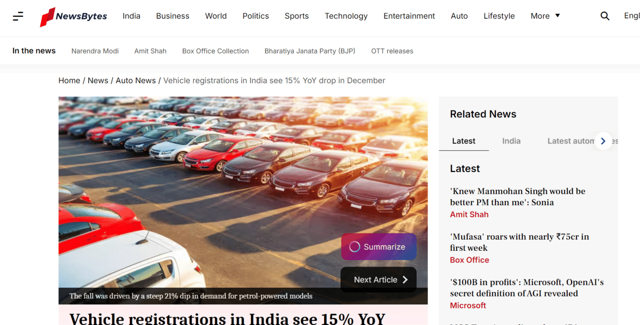 Vehicle registrations in India see 15% YoY drop in December. The number was at about 13.90 lakh units as opposed to 16.40 lakh units during the same period last year.