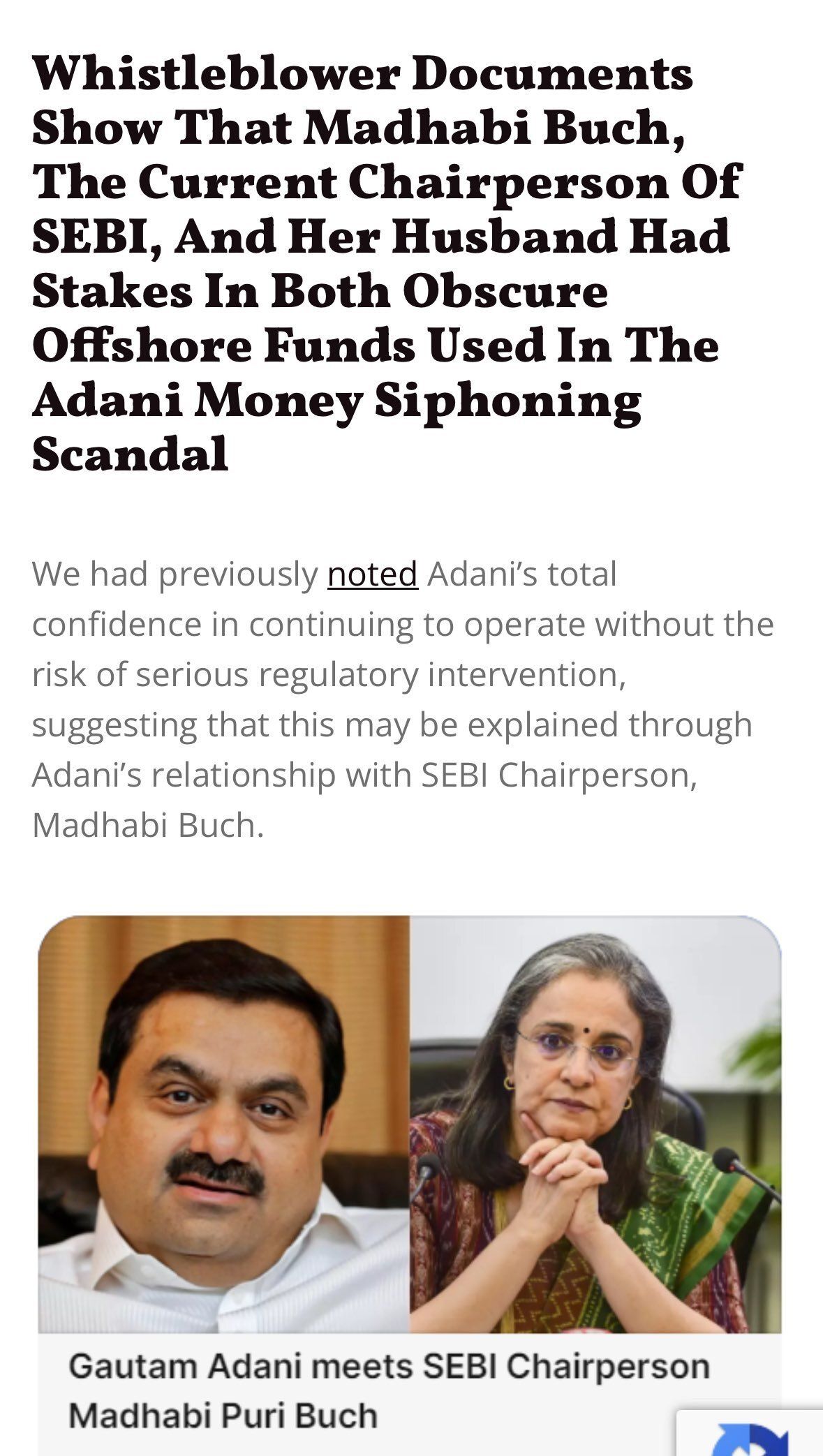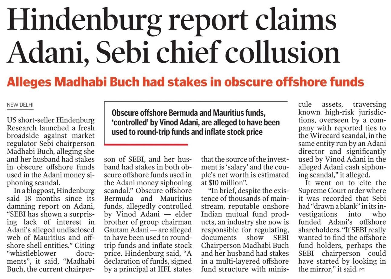 Hindenburg report claims Adani, Sebi chief collusion.#Hindenburg discovered that #SEBI Chairperson Madhabi Buch and her husband, Dhaval Buch, had undisclosed stakes in the same obscure Bermuda and Mauritius funds used by Vinod #Adani.