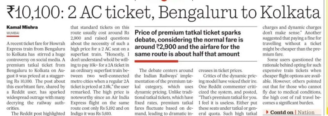 ₹10,100: 2 AC ticket, Bengaluru to Kolkata - Normal fare ₹2,900 - Airfare ₹5,000+