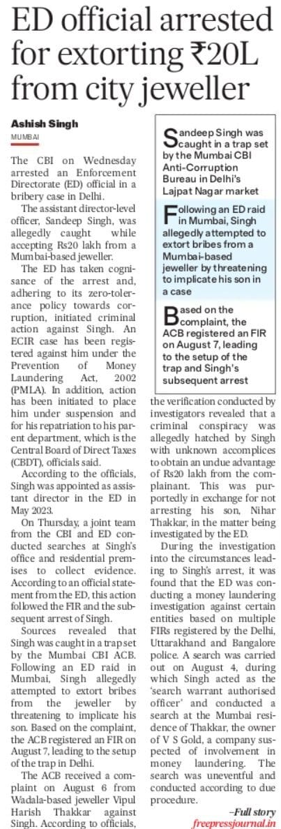 The CBI arrested an Enforcement Directorate assistant director level official in a bribery case in Delhi for extorting ₹20 lakh