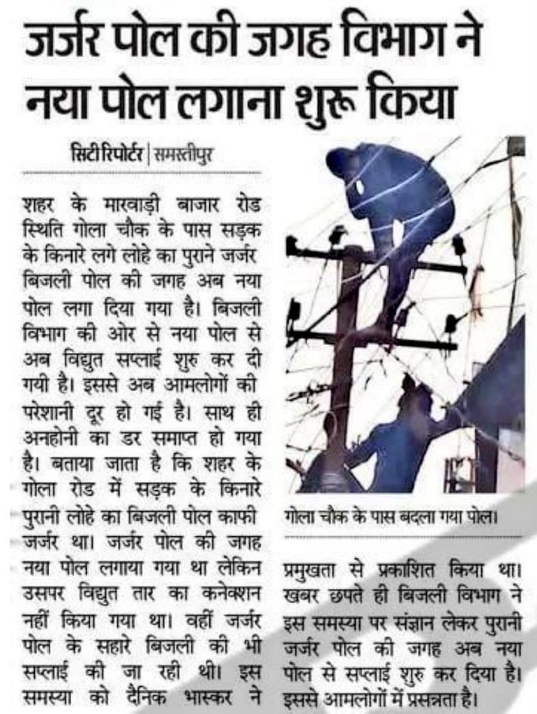 https://x.com/dm_samastipur/status/1862550231633793031?s=48#समस्तीपुर के गोला चौक पर जर्जर बिजली पोल को बदलकर नया पोल स्थापित कर दिया गया है। जिससे आसपास के उपभोक्ताओं को सुरक्षित और गुणवत्तापूर्ण बिजली मिल रही है।