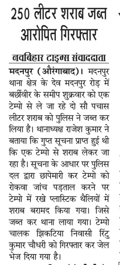 देव मदनपुर रोड में टेम्पो से 250 लीटर शराब जप्त भईल।