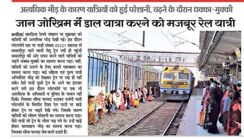 खगड़िया स्टेशन पर यात्री सुरक्षा के साथ खिलवाड़ हो रहा है, प्लेटफार्म की बजाय दूसरे साइड से भी चढ़ने के लिए लोग खड़े रहते हैं RPF/GRP कोई ध्यान नहीं देती है।