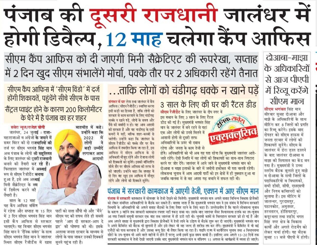 Punjab's second capital will be developed in Jalandhar - camp office will run for 12 months The CM himself will take charge 2 days a week 2 officers will be permanently deployed ...so that people do not have to go to Chandigarh
