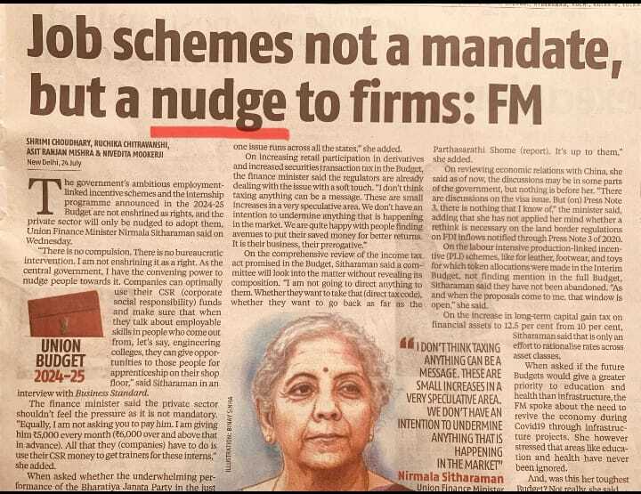 Nirmala JI is fast becoming the biggest bogus and most lying Finance Minsiter the country has had ! In the budget she says they will create 1 Crore Internships and jobs and now she says it was a nudge/recommendation ! I nudge you to resign