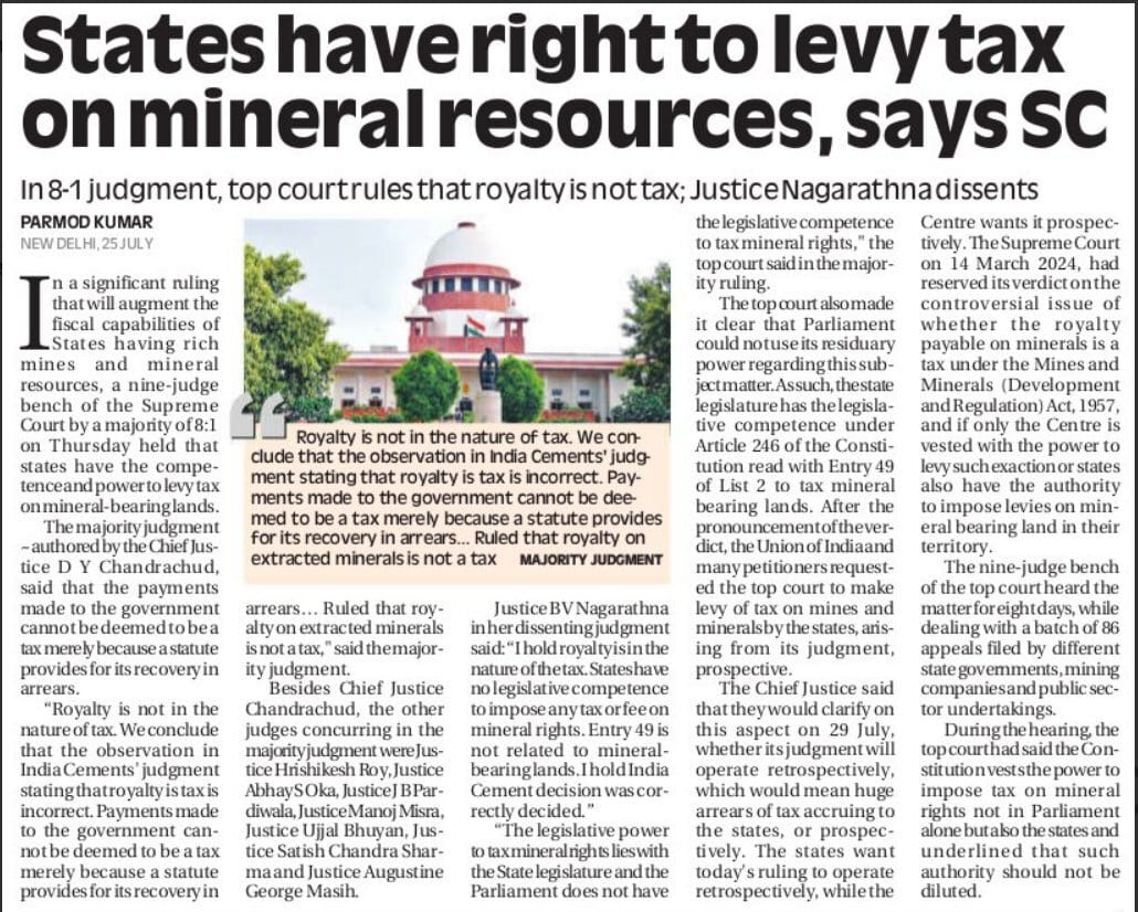 In a landmark judgment, the Supreme Court has ruled that the legislative power to tax mineral rights resides with the states. The court clarified that the royalty paid on minerals is not considered a tax. The decision will greatly increase the income of states rich in minerals.
