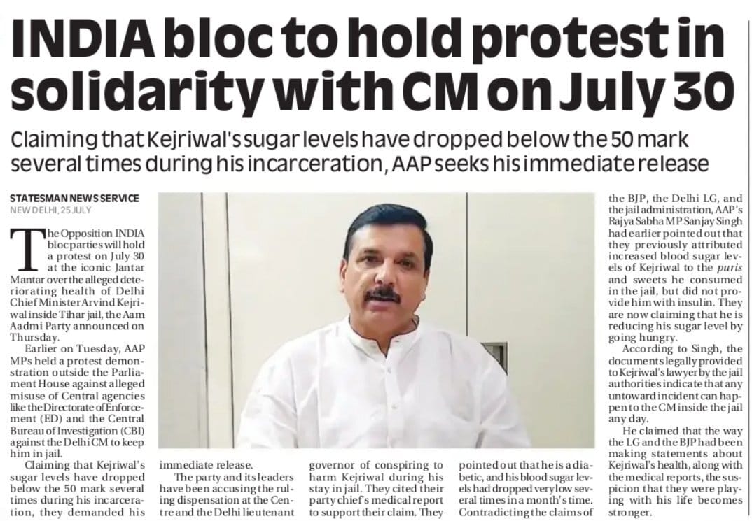 The INDIA bloc of opposition parties will hold a rally on July 30 at the Jantar Mantar here to raise the issue of Delhi Chief Minister Arvind Kejriwal's declining health inside the Tihar Tihar, the AAP said on Thursday.