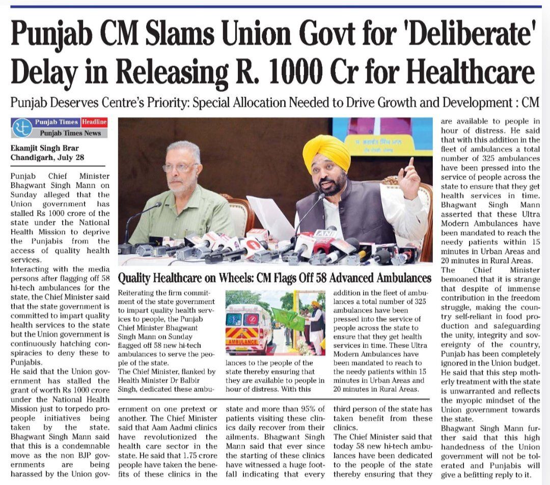 Centre has stalled Punjab's ₹1,000-CR under Nat'l Health Mission to deprive Punjabis from quality healthcare services Punjab deserves special allocation to drive growth & development Condemnable that non-