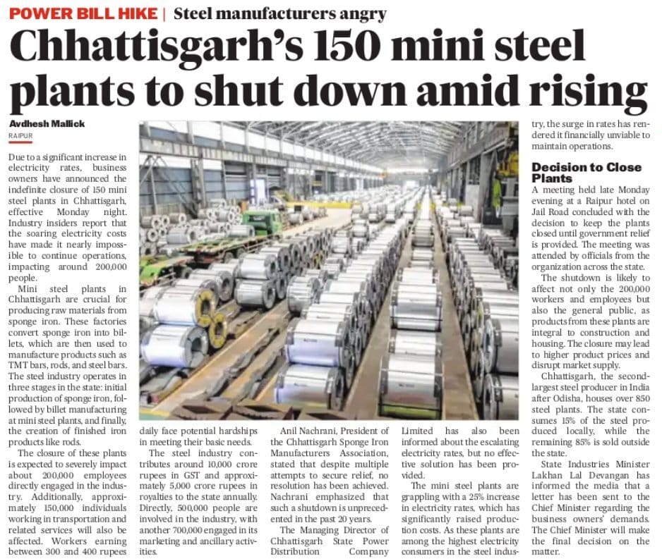 Due to a significant increase in electricity rates, the business owners have announced the indefinite closure of 150 mini-steel plants in Chhattisgarh