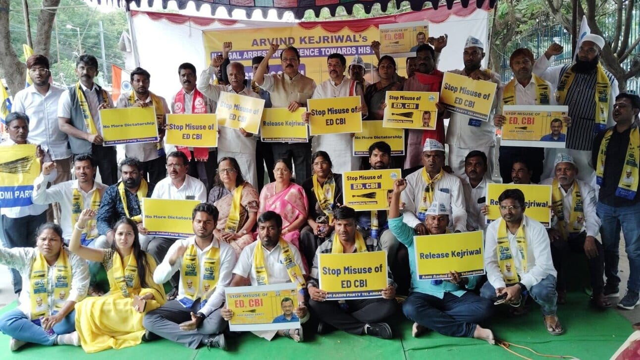 @AAPTELANGANA held a protest at Hyderabad, condemning the Modi govt's plot to harm CM Kejriwal's health