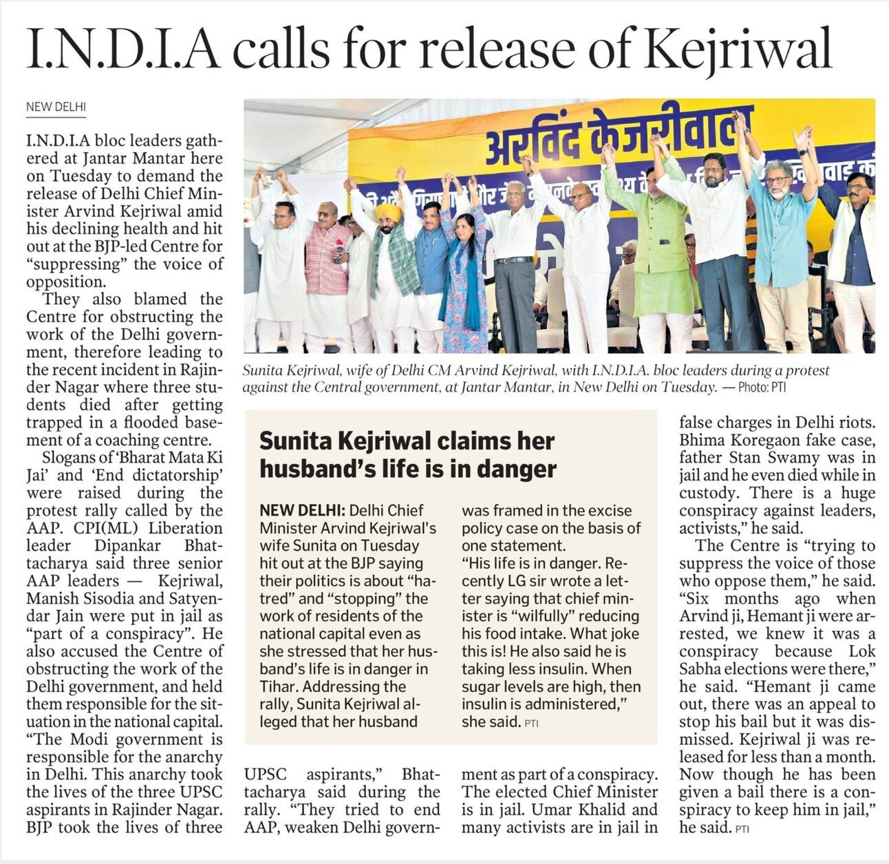 @AAPKarnataka protested at Freedom Park, Bengaluru against the conspiracy of the atrocious Modi Govt to deteriorate his health and keep him in Jail despite getting bai