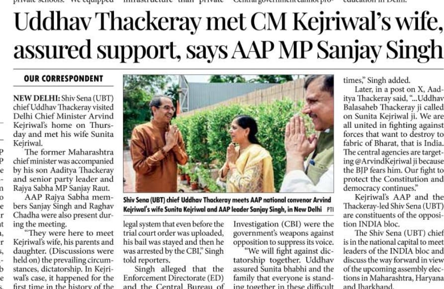 Former Maharashtra CM and Shiv Sena (UBT) chief Uddhav Thackeray along with his son Aaditya Thackeray met Delhi CM and AAP national convenor Arvind Kejriwal's wife Sunita Kejriwal and his parents. AAP MP Sanjay Singh was also present.