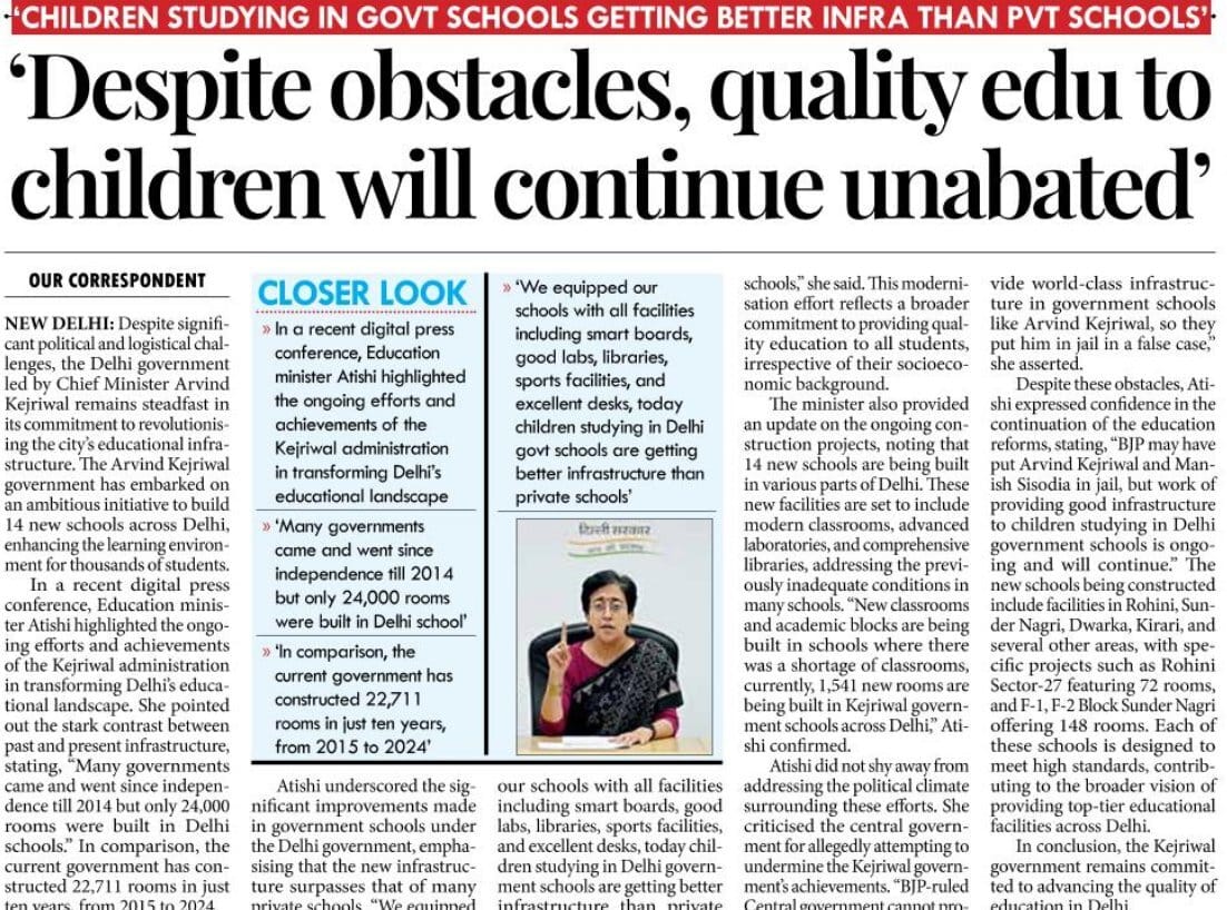 Despite obstacles, quality education to children will continue unabated Many govts came and went since independence till 2014, but only 24,000 classrooms were built in Delhi schools. In comparison, the current govt has constructed 22,711 rooms in just ten years, from 2015 to 2024