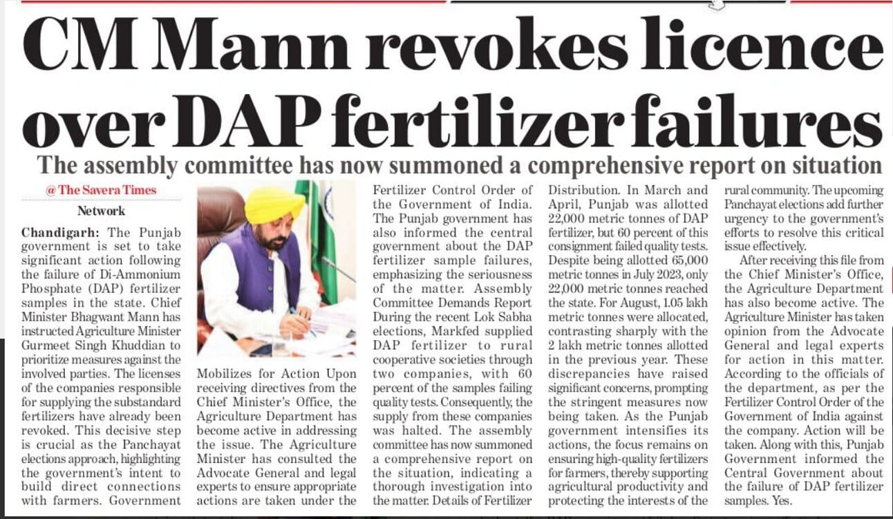 CM Bhagwant Mann revokes licence over DAP fertilizer failures - The assembly committee has now summoned a comprehensive report on the situation