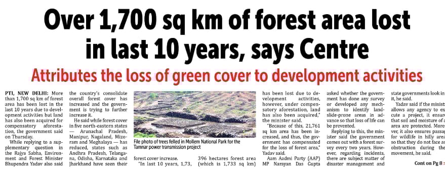 Over 1,700 sq km of forest area lost in last 10 years, says CentreAttributes the loss of green cover to development activities