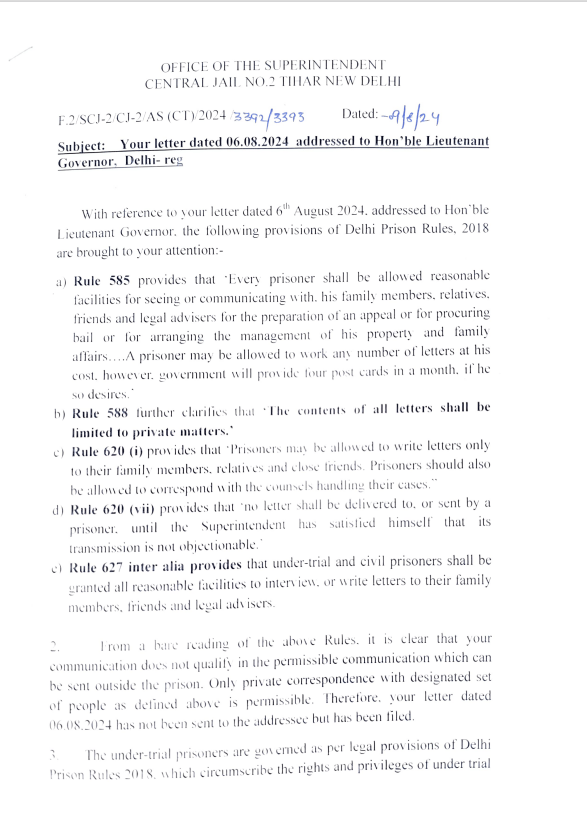 The Superintendent of Tihar Jail has warned Chief Minister Arvind Kejriwal, who is imprisoned, against writing letters from jail, stating that misuse of privileges could lead to his revocation. According to him, the letter sent by Delhi CM to L-G on August 6 was leaked by Kejriwal