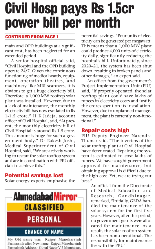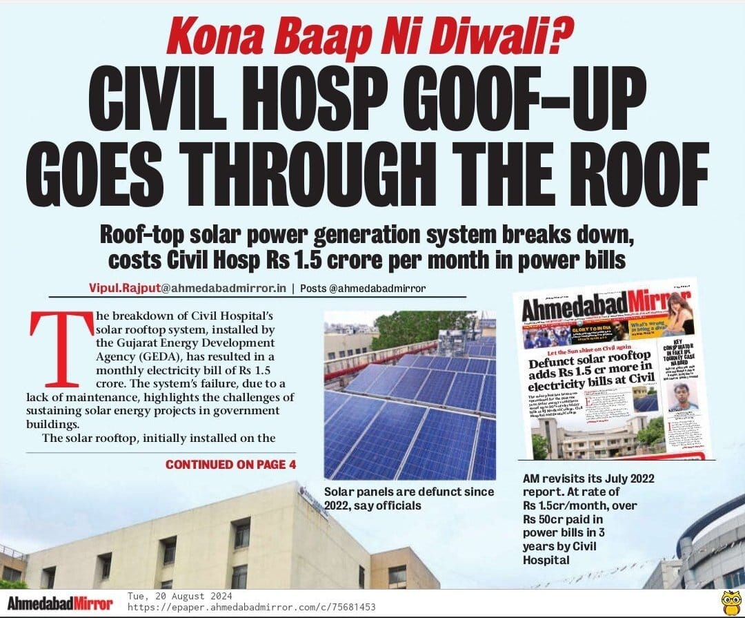The breakdown of Civil Hospital's solar rooftop system, installed by the Gujarat Energy Development Agency, has resulted in a monthly electricity bill of ₹1.5 crore! The solar panels have been defunct since 2022!