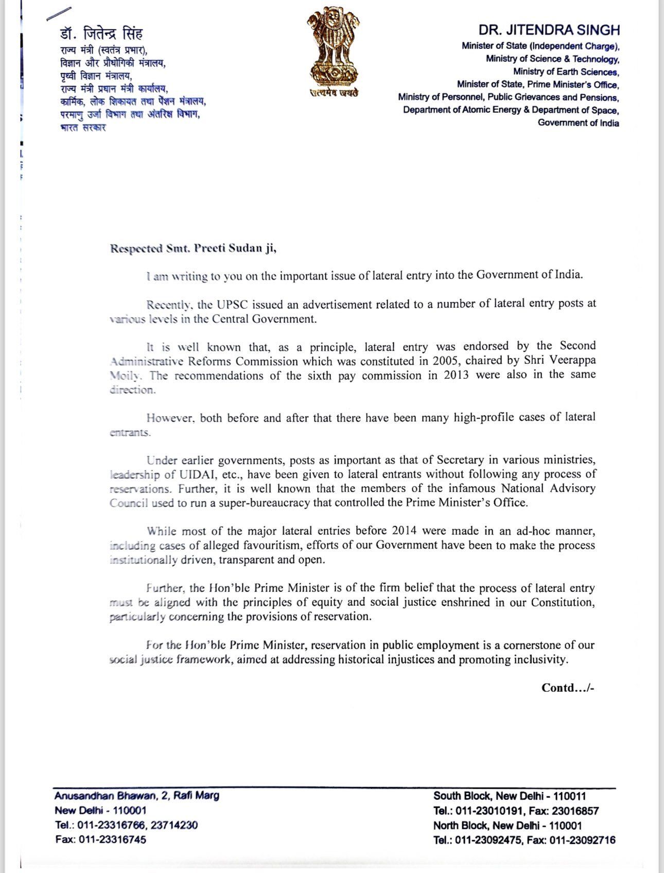 Union Govt writes to UPSC to withdraw advertisement for lateral entry recruitments.