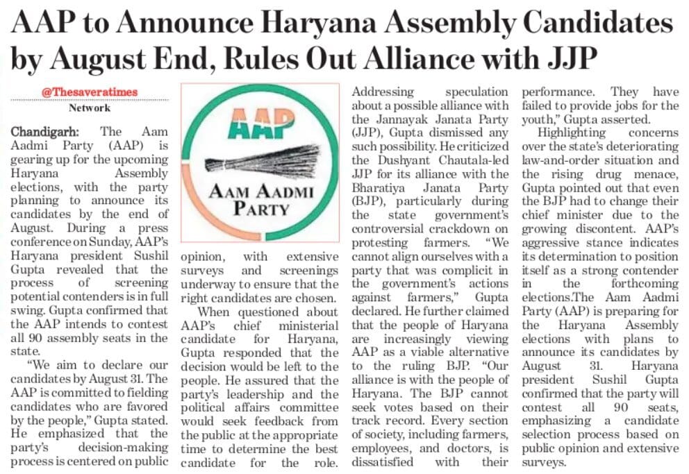 AAP to announce Haryana Assembly candidates by August end - Rules out alliance with JJP