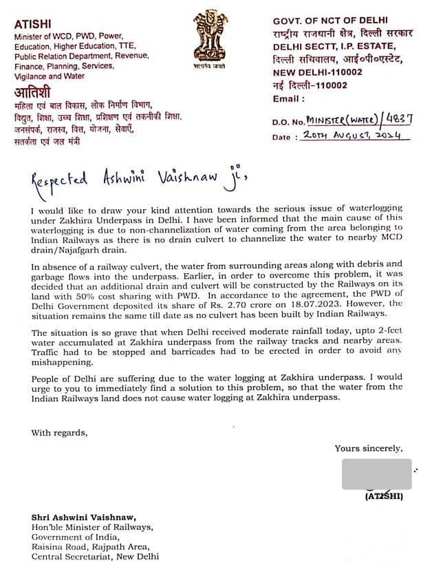 There was waterlogging under Zakhira Underpass in Delhi. Minister Atishi got to the source of the problem; In 2023, Delhi Govt has given its 50% share that is 2.7 Crores to build a culvert. But there has been no progress by the Railways. Kudos to Atishi for swift action.