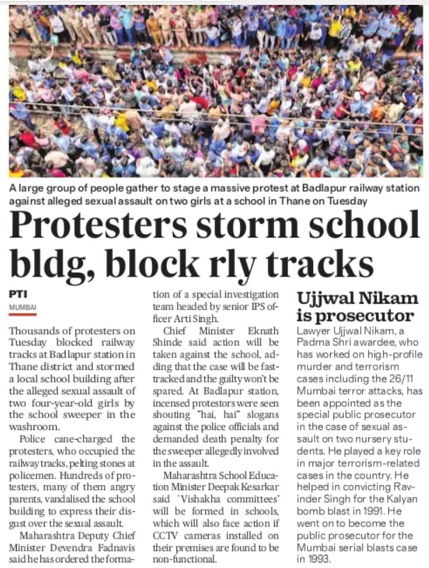 Following a massive protest at #Badlapur in #Maharashtra's Thane district over the alleged sexual abuse of two kindergarten girls, internet services in the town were suspended while most schools remained shut.