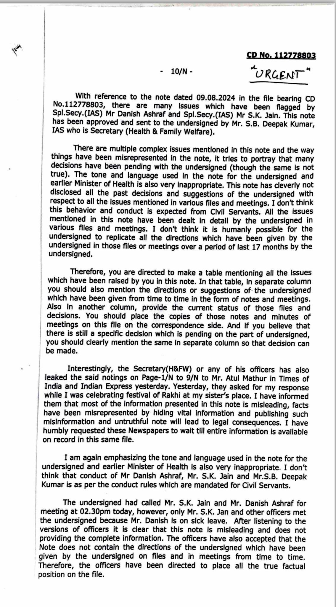 Delhi Health Minister @Saurabh_MLAgk expresses strong displeasure over the language used in a note sent by Secretary (H & FW) S.B. Deepak Kumar, highlighting the presence of misleading information. The Note has deliberately not disclosed the directions of Ministers from time to time in the issues The Health Secretary has been asked to place all facts in the form of table to present complete picture The officers of Health Dept in meeting accepted that information in note is incomplete & misleading
