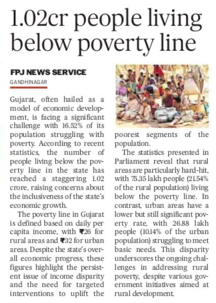 Gujrat, often hailed as a model of economic development, is facing a significant challenge with 16.52%1.02 crore of its population living below poverty line