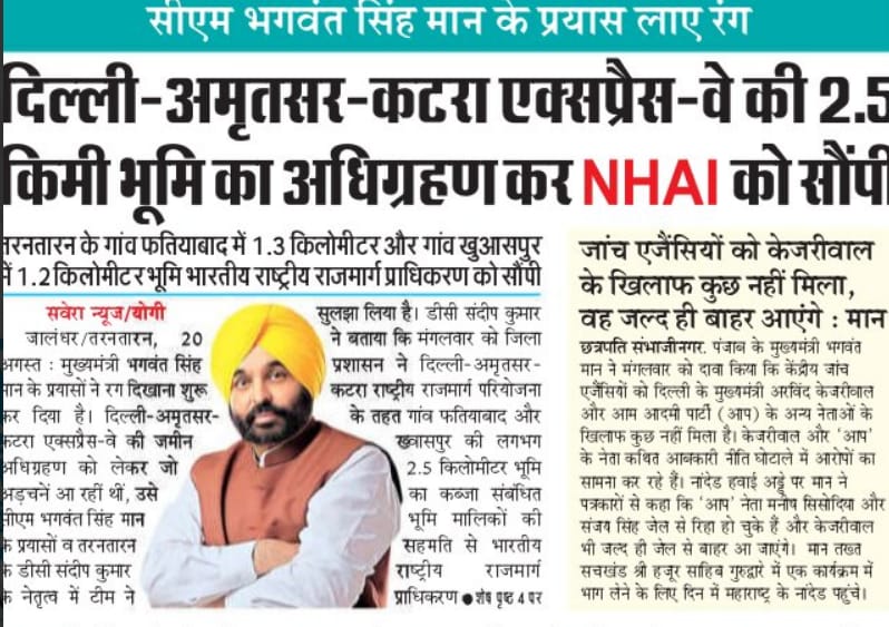 CM Bhagwant Singh Mann's efforts bore fruit - 2.5 km land of Delhi-Amritsar-Katra Expressway was acquired and handed over to NHAI