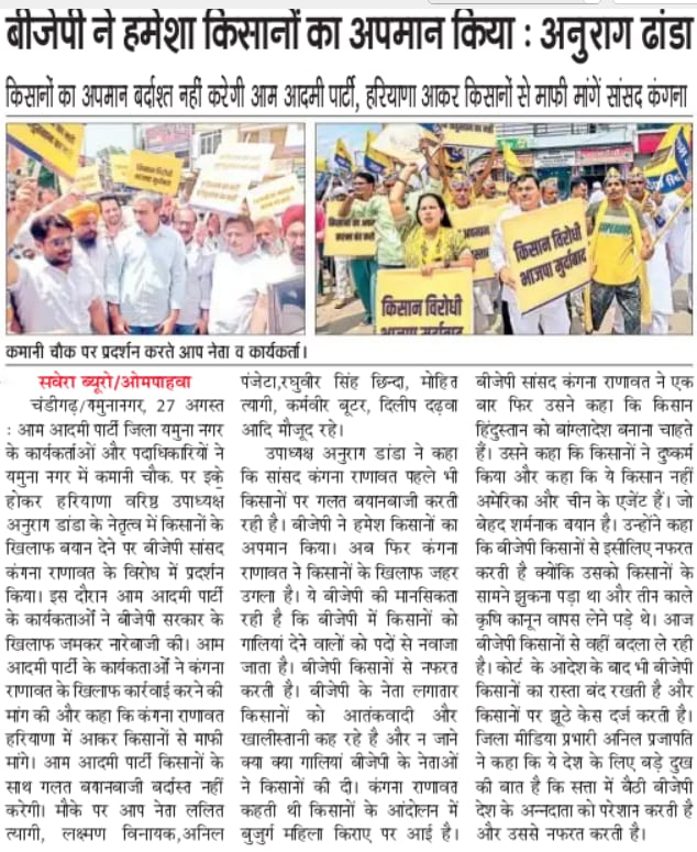 Kangana calling farmers rapists is shameful. BJP has always insulted farmers. Kangana should come to Haryana and apologize to the farmers: Anurag Dhanda