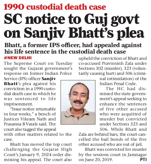 The Supreme Court sought the Gujarat government's response on former IPS officer Sanjiv Bhatt's plea against his conviction