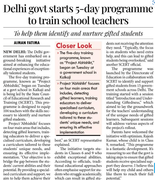 The State Council of Educational Research and Training (SCERT). This programme will equip 104 teachers with the skills to identify and nurture gifted students.